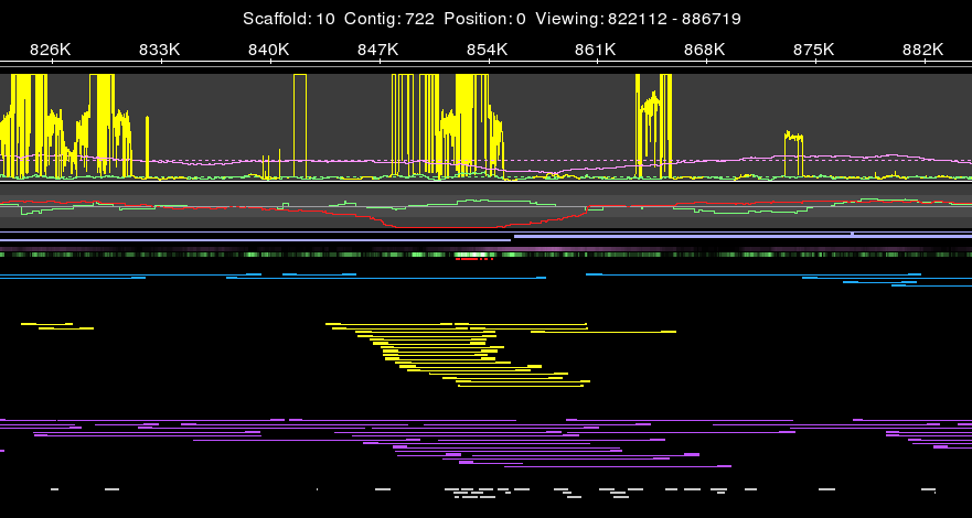 The view is divided into 3 regions. Along the right is the control panel (f in the picture) and details panel (g) which allows users to filter and set parameters of the display and see the details of selected objects. Along the bottom left (e) is an overview of the entire scaffold, showing the contig placement and features. The rest of the display (a-d), the main display, shows the placement of the contigs (b), features (c), and inserts (d), and the statistical levels (a) of the currently selected region of the scaffold. The range slider below the overview and the magnifying glass tools allow users to select the region of interest. The display is interactive, and the details on every object are available on demand by clicking on the object. Return to top Mis-assembly DetectionThe combinations of evidence displayed in the scaffold view makes it possible to quickly identify mis-assemblies. Consider the region displayed below where happymates have been hidden, and k-mer coverage is plotted but otherwise uses default parameters. Our analysis begins at the cluster of yellow compressed inserts. Individually, a single compressed mate is not unusual since inserts sample the library distribution, but this is an unusually large cluster. Similiarly, the cluster of singleton mates (purple) below the compression is unusually large. Moving up, the small red features indicated there are multiple correlated SNPs in that same region, but this is a haploid organism. Further investigation in the Contig View should be used to confirm it is not chance correlations, but given the low background distribution of correlations, we can assume this is most likely due to mis-assembly. The bright white in the read coverage heat map indicates this is the highest read coverage in the scaffold. The CE Statistic indicates a very strong compression, and at -6 is well below the threshold. Finally, the spike in kmer coverage in yellow at the top of the plot indicates this is a complicated repeat region. Every mis-assembly characteristic has been met and we can conclude undeniably that this is a mis-assembly. In contrast, note the repeat (high kmer coverage) on the left of the plot has only 2 compressed mates, no correlated SNPs, and even coverage. This demonstrates the difficulty in understanding mis-assemblies: while nearly every mis-assembly occurs in a repeat, not every repeat is mis-assembled, and the presense of individual mis-assembly clues such as individual compressed mates are inconclusive. It is only the combination of evidence that allows one to prove mis-assembly.