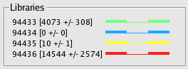 LibrariesThe final region of the control panel is a legend for the libraries. Each library is listed by iid along with their mean and standard deviation. The color code is represented by a sample insert, but the same colors are also used for the CE statistic plot.