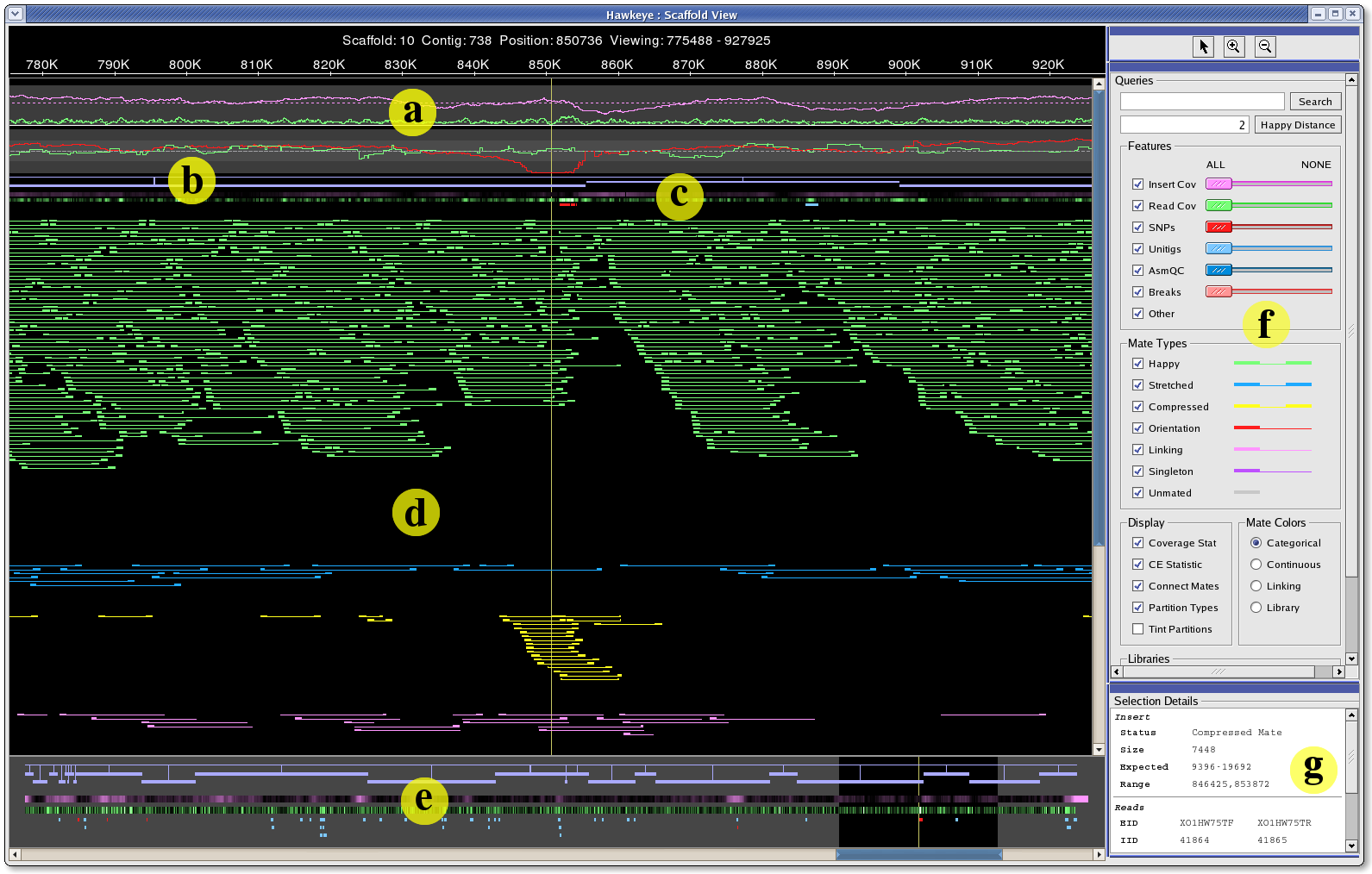 Main DisplayThe main display (a-d) shows the contigs, inserts, features, and statistical information for a region of the scaffold. The scaffold of contigs (b) is represented as rectangles appropriately spaced and sized. The color of the rectangle indicates if the contig is oriented forward (blue) or reverse (dark blue) in the scaffold. Immediately beneath the contigs are two heatmaps. The first in purple highlights regions where the insert coverage is exceptionally high or low. Similarily, the green track highlights high and low read coverage. FeaturesBeneath the heatmaps, are the the feature tracks. Features are regions of scaffolds or contigs that have been selected for having interesting features. AMOS comes bundled with tools for computing mis-assembly type features, but arbitrary features of any type can be loaded from a tabbed deliminate file using 'loadFeatures'.