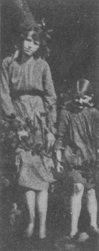 went into the woods near a water-fall. Frances 'ticed' them, as they call it, and Elsie stood ready with the camera. Soon the three fairies appeared, and one pixie dancing in Frances' aura. Elsie snapped and hoped for the best. It was a long time before the father would develop the photo, but at last he did, and to his utter amazement the four sweet little figures came out beautifully!