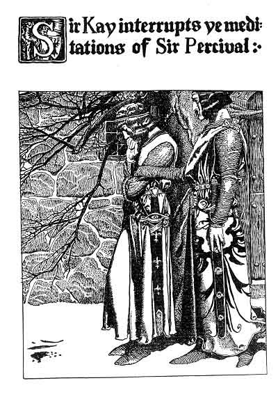 Now it befell at that time that there came a party riding through those parts, and that party were Sir Gawaine and Sir Geraint and Sir Kay. And when they saw Sir Percival where he stood leaning against a tree and looking down upon the ground in deep meditation, Sir Kay said: "Who is yonder knight?" (For he wist not that that knight was Sir Percival.) And Sir Kay said further: "I will go and bespeak that knight and ask him who he is."