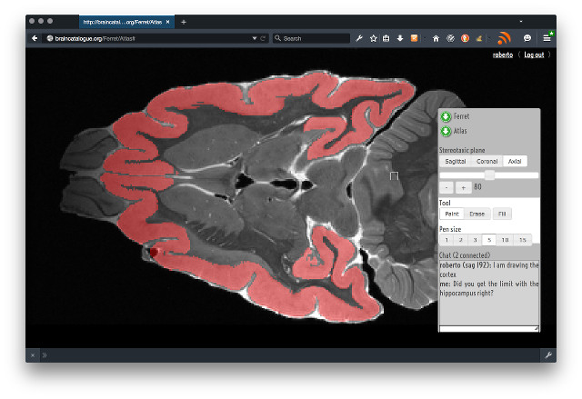 We are constituting an open, collaborative atlas of ferret brain development, integrating multi-modal and multi-scale data. We are acquiring data from many animals, from newborns to adults, using high-resolution MRI, diffusion weighted imaging (DWI) and high-throughput histology. Brains will be sectioned at 25 μm and scanned at 0.25 μm of resolution, and processed for real-time multi-scale visualisation. We are building a web-platform to integrate an interactive multi-scale visualisation of the data. Using our combined expertise in computational neuroanatomy, multi-modal neuroimaging, neuroinformatics, and the development of inter-species atlases, we are building an open-source web platform to allow the collaborative, online, creation of atlases of the development of the ferret brain. The web platform will allow researchers to access and visualise interactively the MRI and histology data. It will also allow researchers to create collaborative, human curated, 3D segmentations of brain structures, as well as vectorial atlases. Our work should provide a first integrated atlas of ferret brain development, and the basis for an open platform for the creation of collaborative multi-modal, multi-scale, multi-species atlases.