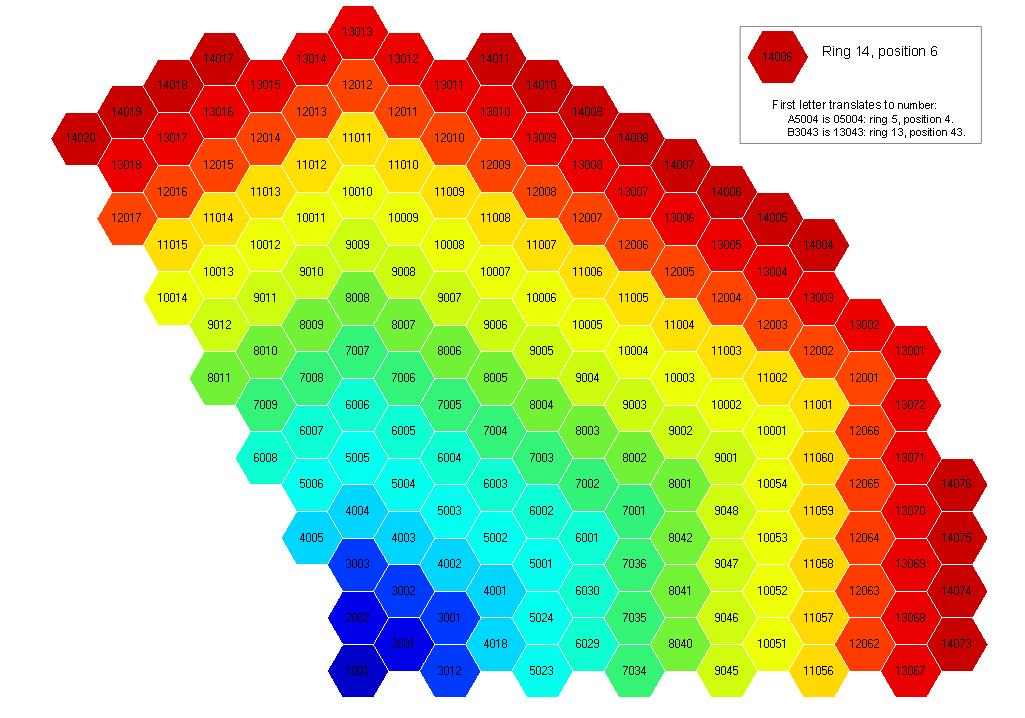 An example Location is represented as A5002B. The first two digits represent the ring. A5 is actually ring 05. A7 is 07. B3 is 13. The final digit represents the axial location, starting with A at the bottom. The representation starts with a letter because DIF3D doesn’t allow region labels to start with a numeric character, and the original purpose of Location was to be written directly to DIF3D inputs. But you don’t have to convert the name to get the ring number. Just use the Location.mainIndices method.